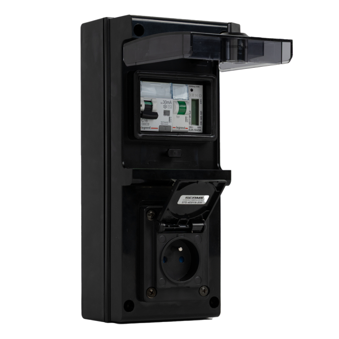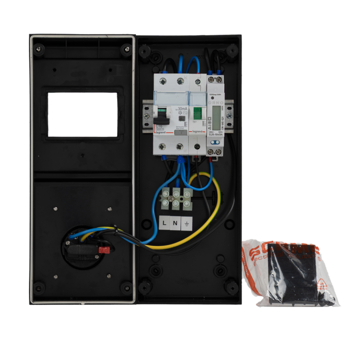 Таблото включва дефектнотокова защита Legrand и еднотарифен електромер ORNO с импулсен изход и MID сертификат. За зареждане