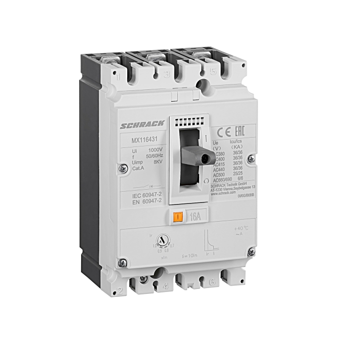 Модулни мощности автоматични прекъсвачи с лят корпус Schrack MX, предназначени за защита на електрически вериги от късо съединение или претоварване.