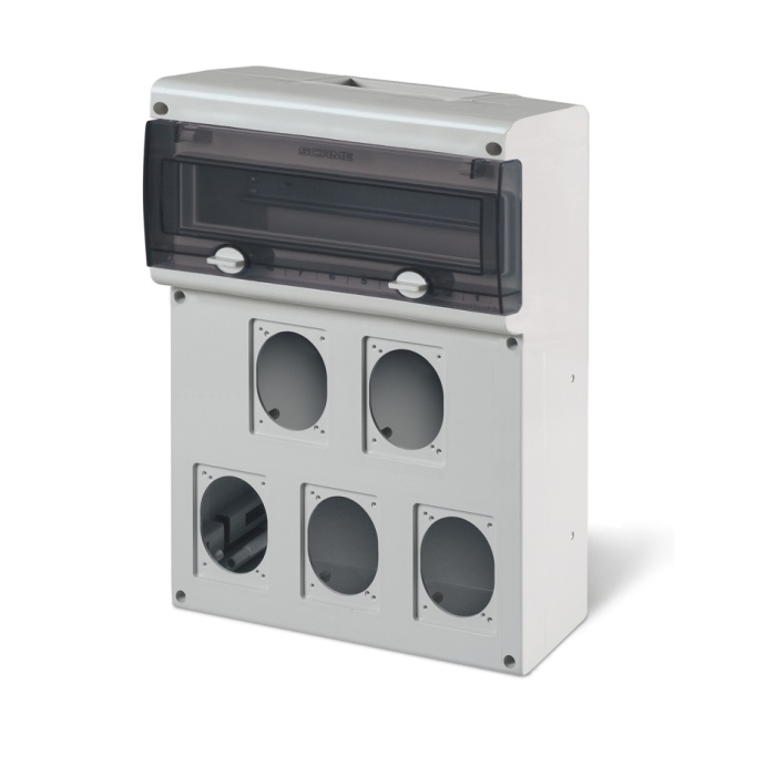 Scame Domo e гама от индустриални табла изработени от висококачествена удароустойчива термопластмаса, с горна камера за монтаж на DIN модули и възможност за монтаж на различен брой промишлени и шуко контакти според модела.
