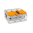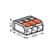 Безвинтова тройна клема тип бърза връзка Wago за гъвкави или твърди проводници. Лесна за употреба - вдига се лостчето, проводникът се защипва и лостчето се затваря за безопасна и здрава връзка. Серията се предлага за 2, 3 или 5 проводника.