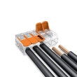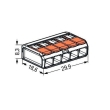 Безвинтова клема за 5 проводника тип бърза връзка Wago за гъвкави или твърди проводници. Лесна за употреба - вдига се лостчето, проводникът се защипва и лостчето се затваря за безопасна и здрава връзка. Серията се предлага за 2, 3 или 5 проводника.